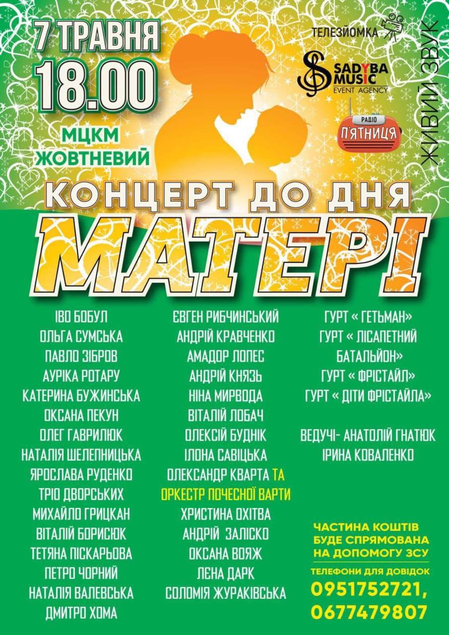 7 травня о 18:00 у МЦКМ «Жовтневий» відбудеться великий святковий концерт, присвячений Дню матері — тепла й зворушлива подія, що вшановує найріднішу людину в житті кожного з нас.