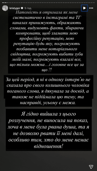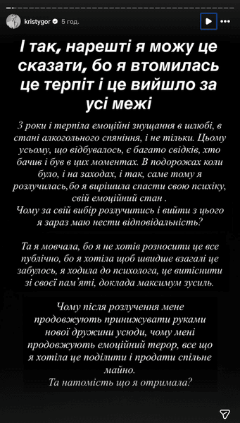 Горняк стверджує, що протягом трьох років терпіла емоційне знущання, але зрештою вирішила розлучитися, аби "врятувати свою психіку та емоційний стан". Вона також зазначила, що після розриву нібито зіткнулася з хвилею публічних образ, погроз та спроб дискредитувати її професійну репутацію в соцмережах. Про це вона розповіла в сториз в Instagram.