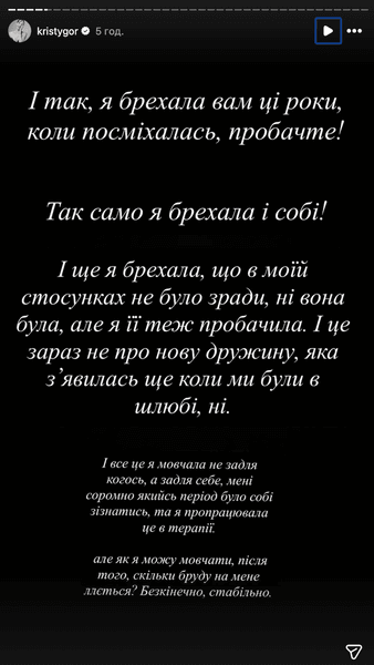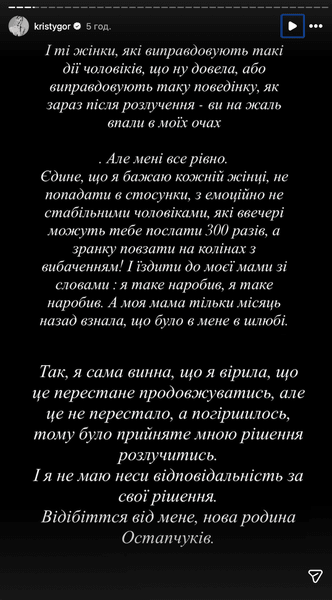 Окремо Горняк заявила, що у шлюбі була і зрада, про яку вона раніше не говорила відкрито. Водночас вона підкреслила, що не звинувачує нову дружину Остапчука, але закликала сторонніх осіб не втручатися у її приватне життя та професійну діяльність.