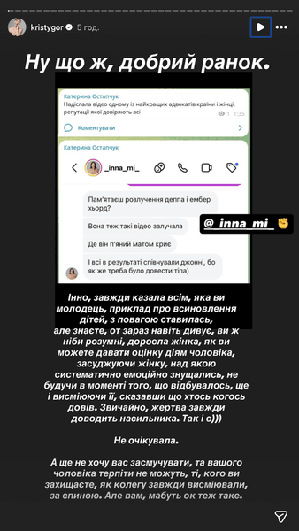 Нотаріуска та блогерка Христина Горняк уперше публічно розповіла про складні обставини шлюбу з Остапчуком та заявила про пережите насилля. Вона повідомила, що тривалий час зазнавала емоційного тиску та принижень, зокрема під час конфліктів, які, за її словами, часто відбувалися у стані алкогольного сп’яніння колишнього чоловіка.